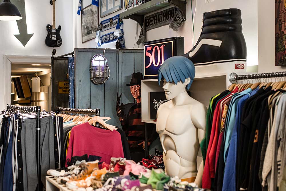 Over the years the store became a source for many stylists and costume designers, who rent and buy our clothing for photo shoots, commercials, movies and plays. To make life a little easier for them, we now have an archive. It stocks a big and carefully selected collection of vintage band shirts, Redwing Boots, denim, sunglasses, dresses, leather jackets and belts among many other things. The majority of the collection is linked to subcultures such as Rock, Punk, Metal, Skateboarding, Hip Hop or Rave, This stuff is only for rent and not for sale. It is for professional use only.
